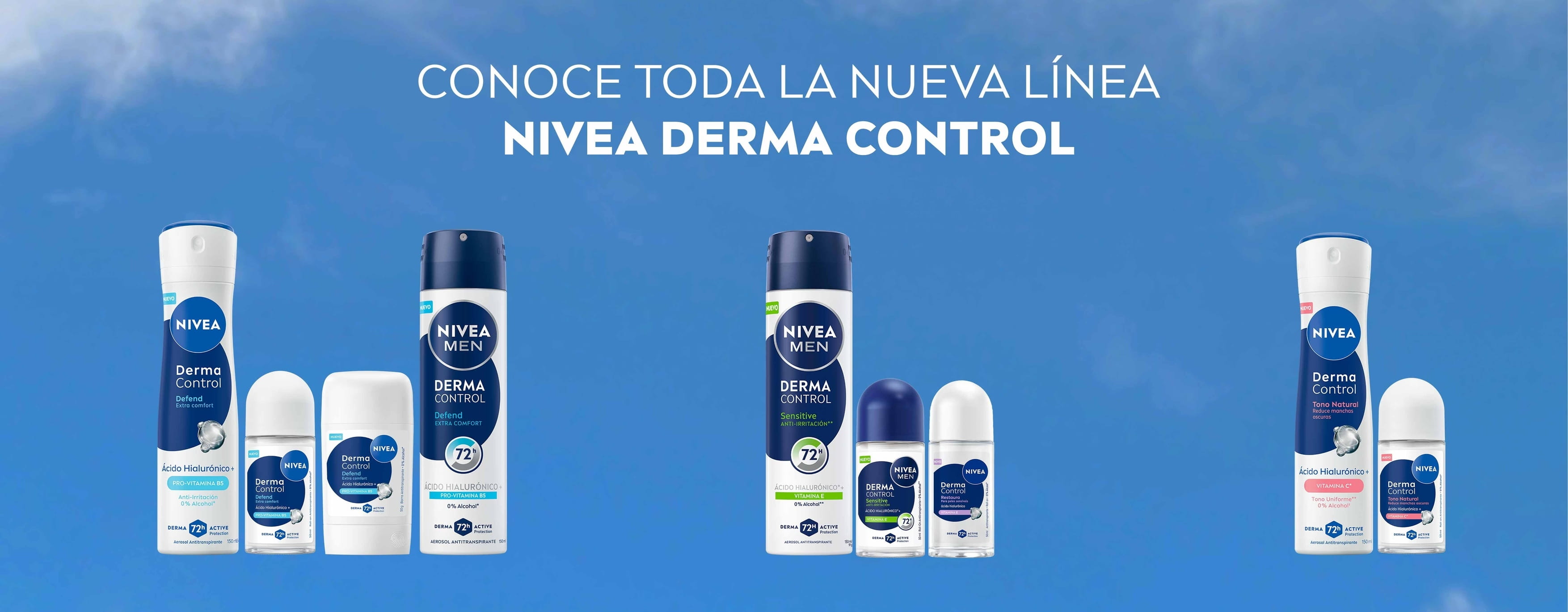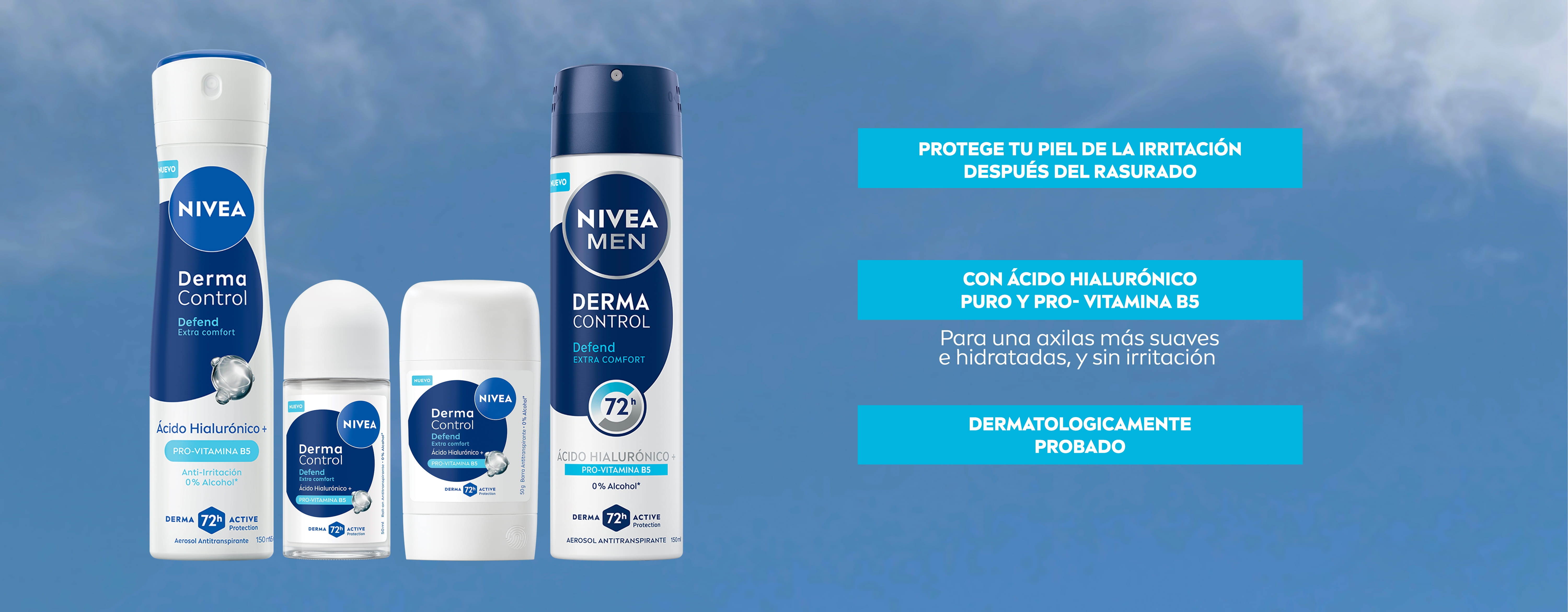 NUEVO Nivea Derma Control con Ácido Hialurónico Puro, Pro-Vitaminas B5 y Vitamina C que calma e hidrata la piel de las axilas y fortalece la defensa de la piel contra la irritación.