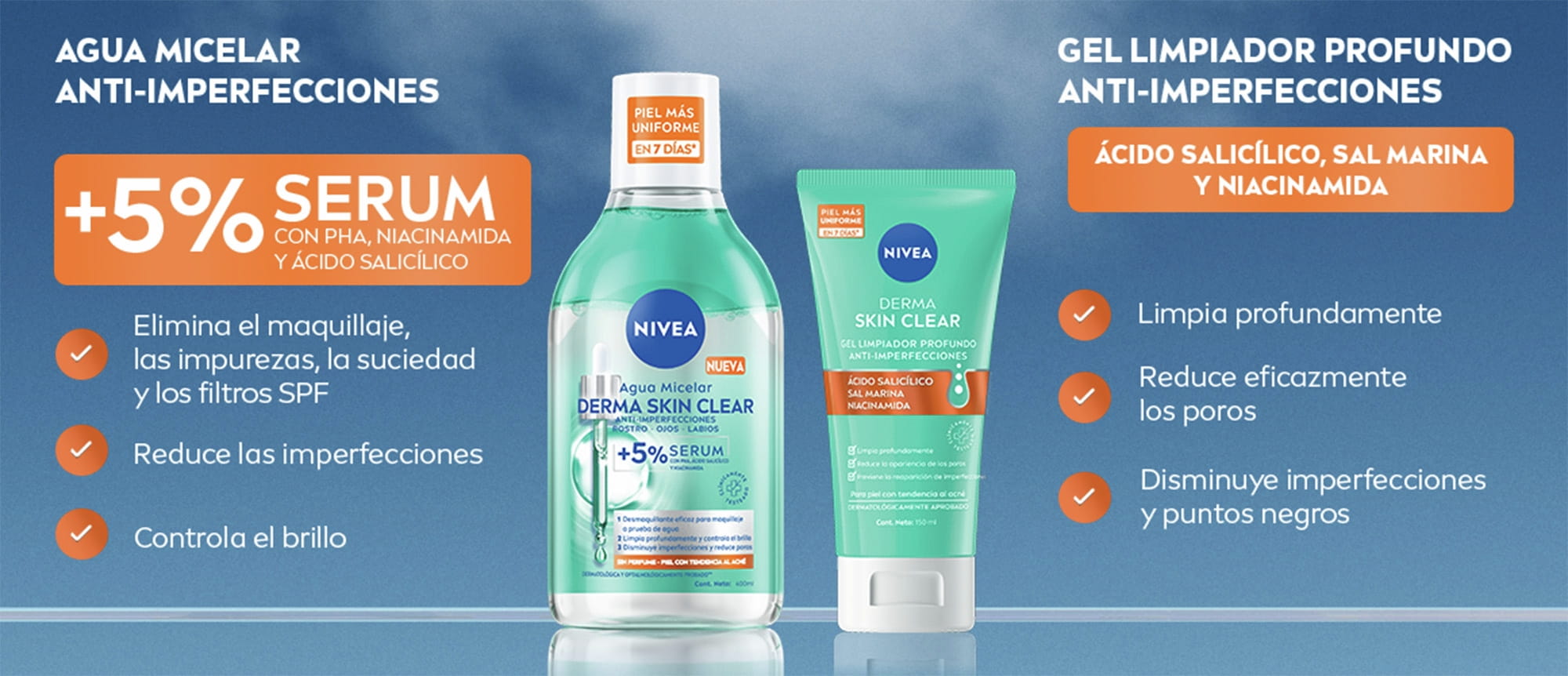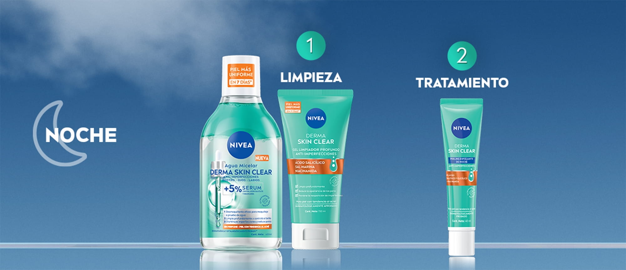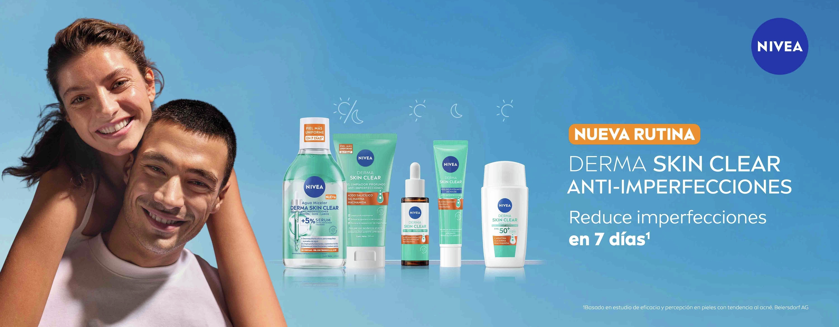 Con sus poderosos ingredientes activos, la nueva linea NIVEA Derma Skin Clear actúa en tu piel para reducir imperfecciones en 7 días1, !Toma el control de tu piel¡