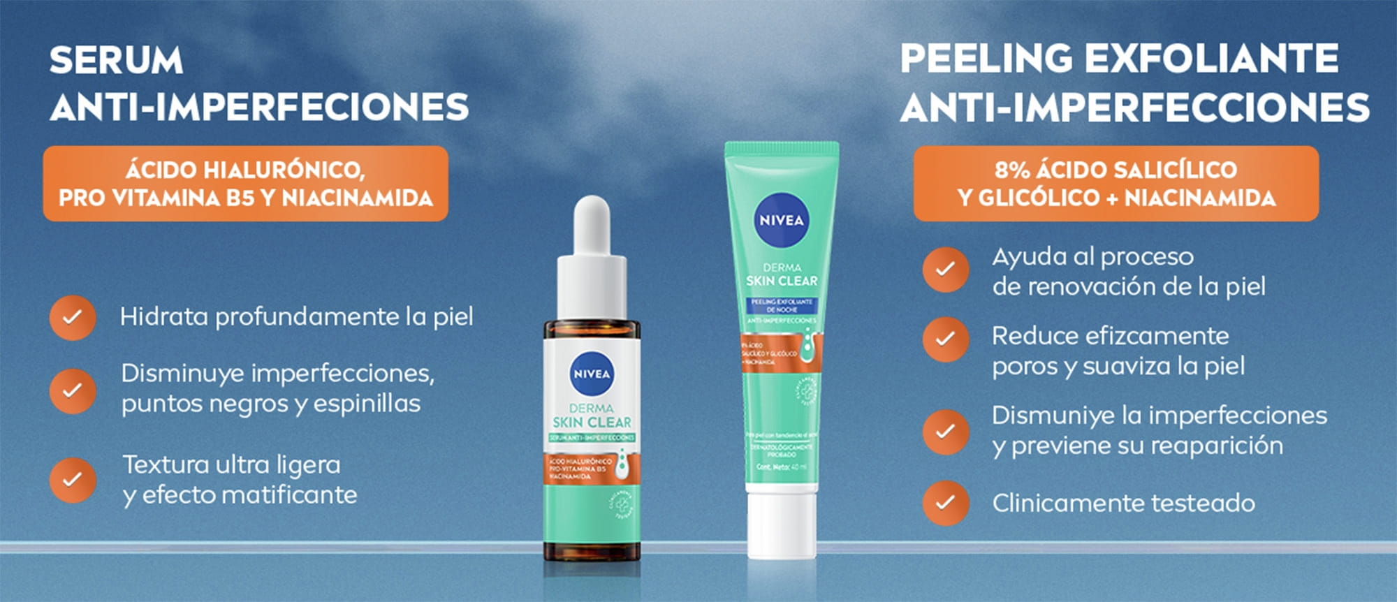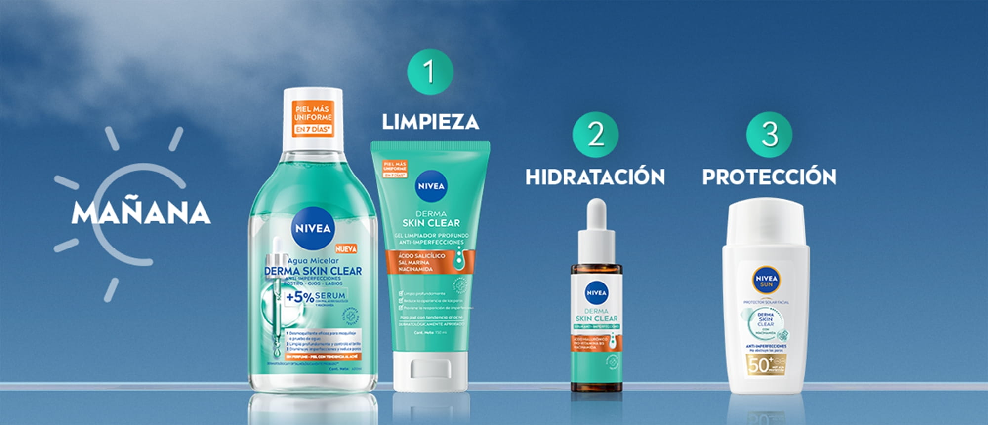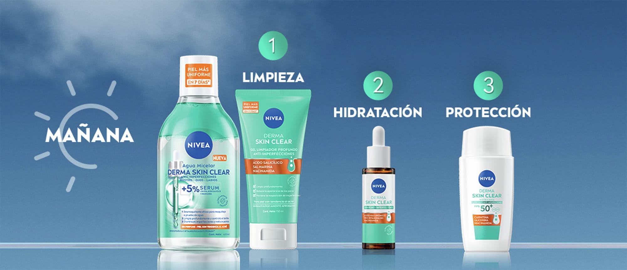 Con sus poderosos ingredientes activos, la nueva linea NIVEA Derma Skin Clear actúa en tu piel para reducir imperfecciones en 7 días1, !Toma el control de tu piel¡