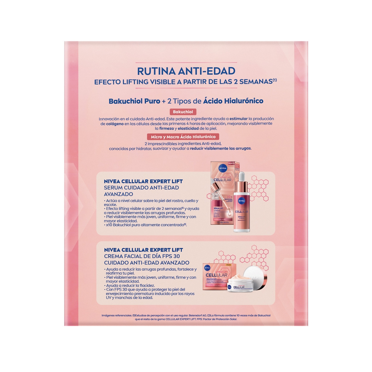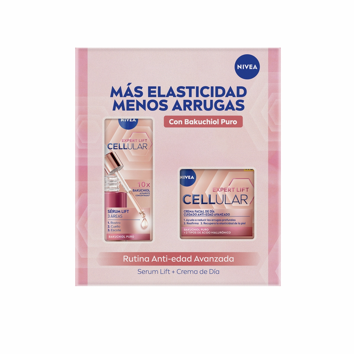 Eleva tu rutina anti-edad con el poder lifting de NIVEA Cellular Expert Lift. El serum con x10 Bakuchiol puro actúa a nivel celular para reducir visiblemente las arrugas profundas y redefinir el contorno del rostro en tan solo 2 semanas. La crema de día, con FPS 30, fortalece, reafirma y protege la piel del envejecimiento prematuro. Piel visiblemente más firme, elástica y rejuvenecida todos los días.