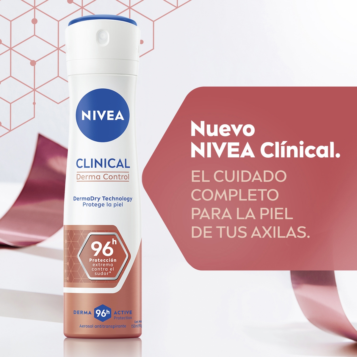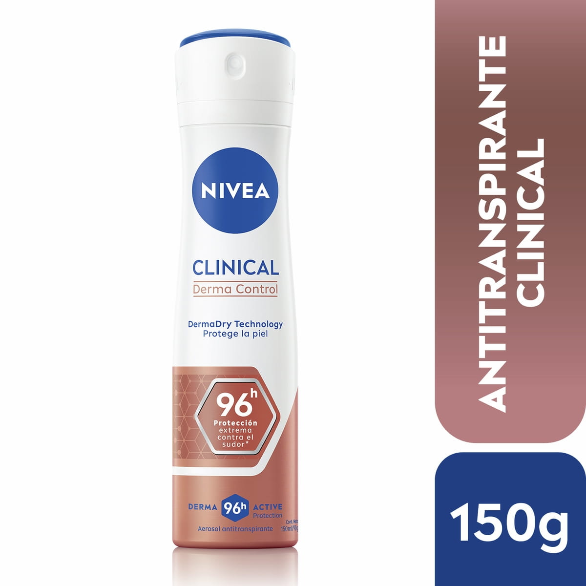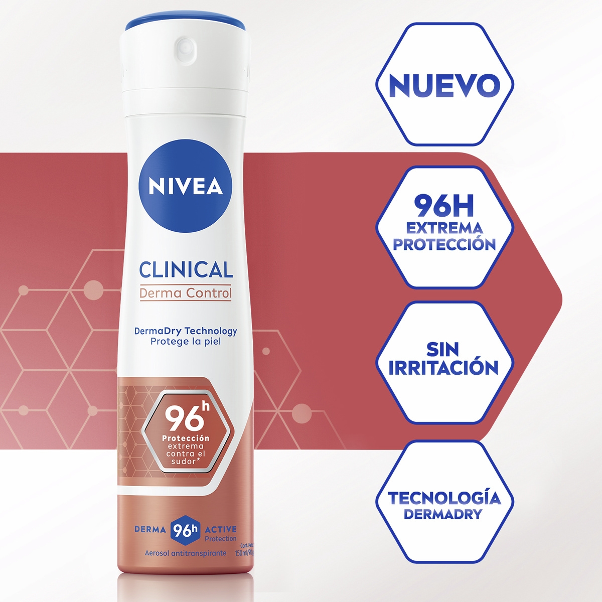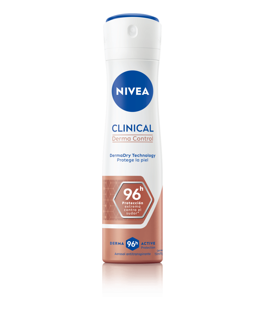 El spray antitranspirante más potente de NIVEA que proporciona 96 horas de protección contra el sudor, la humedad y el olor excesivos mientras protege la piel: NIVEA Clinical Derma Control.