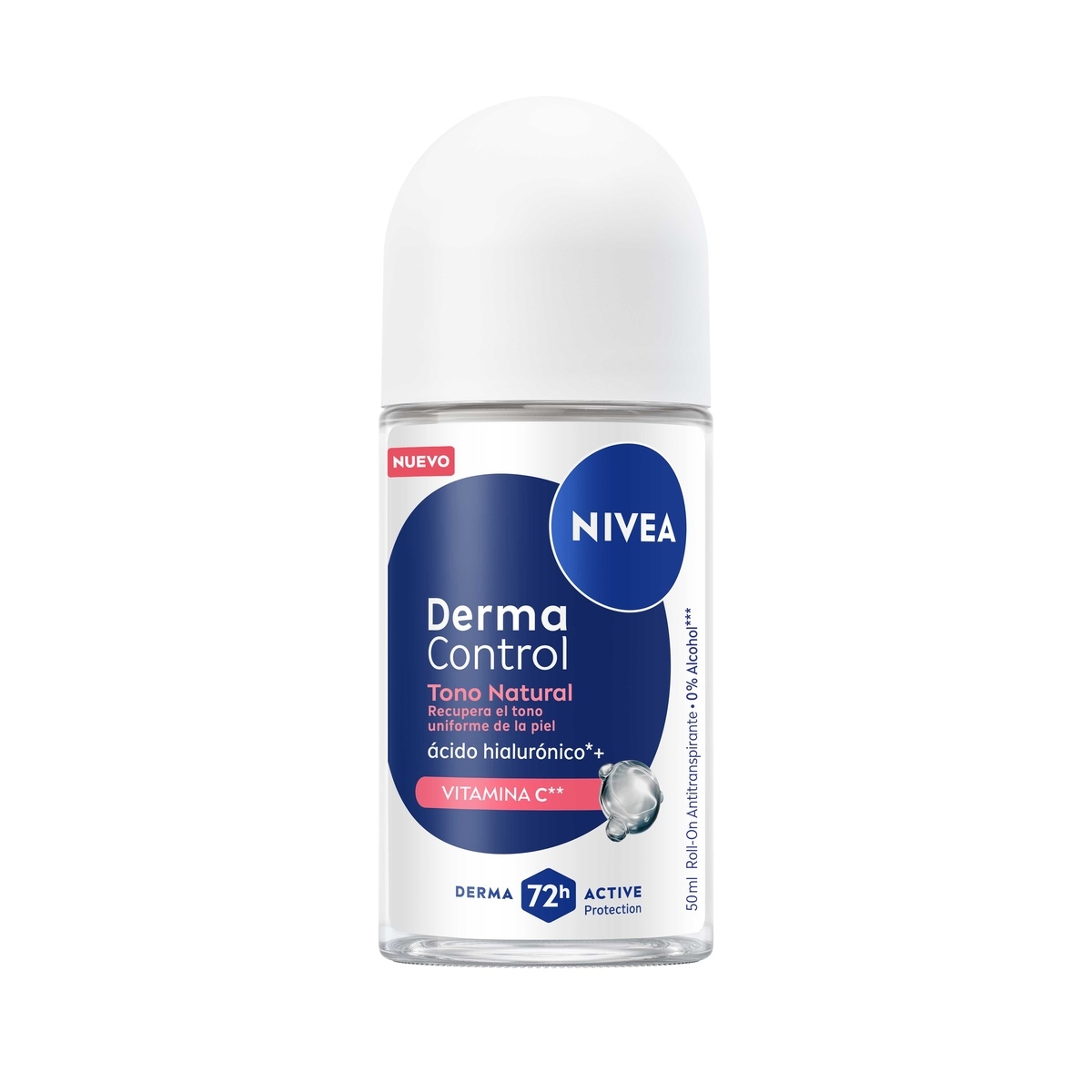 NIVEA Derma Control Tono Natural, con Ácido Hialurónico Puro y Vitamina C, reduce las manchas oscuras después del afeitado y ayuda a recuperar un tono de piel uniforme. Sus antitranspirantes ofrecen 72 horas de protección contra sudor y mal olor, dejando tus axilas más suaves y con una sensación de piel saludable.