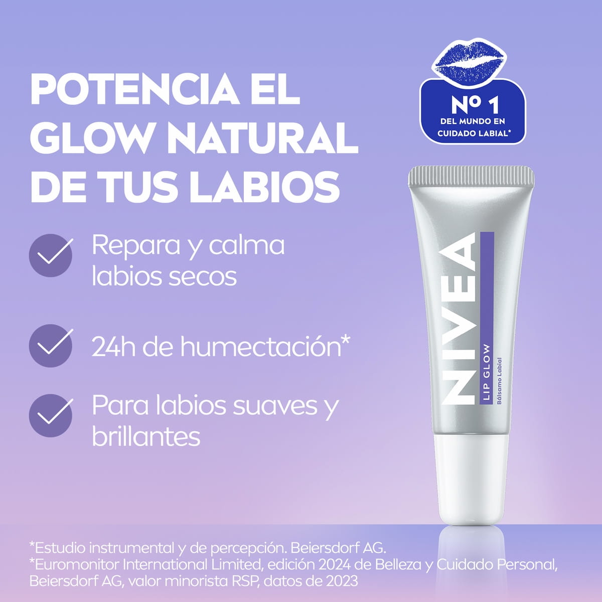 NIVEA Lip Glow 10 ml hidrata intensamente por 24 horas con Ácido Hialurónico y extracto de Magnolia, dejando los labios suaves, regenerados y con un brillo natural instantáneo.
