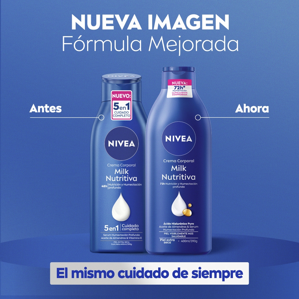Fórmula mejorada. Piel Visiblemente más saludable con cada uso. Nutrición profunda por 72h*. Mantiene la hidratación. Para una piel notablemente suave y tersa. Enriquecida con Ácido Hialurónico Puro, Aceite de Almendras & Serum de Humectación Profunda. Sin sensación grasosa y rápida absorción.