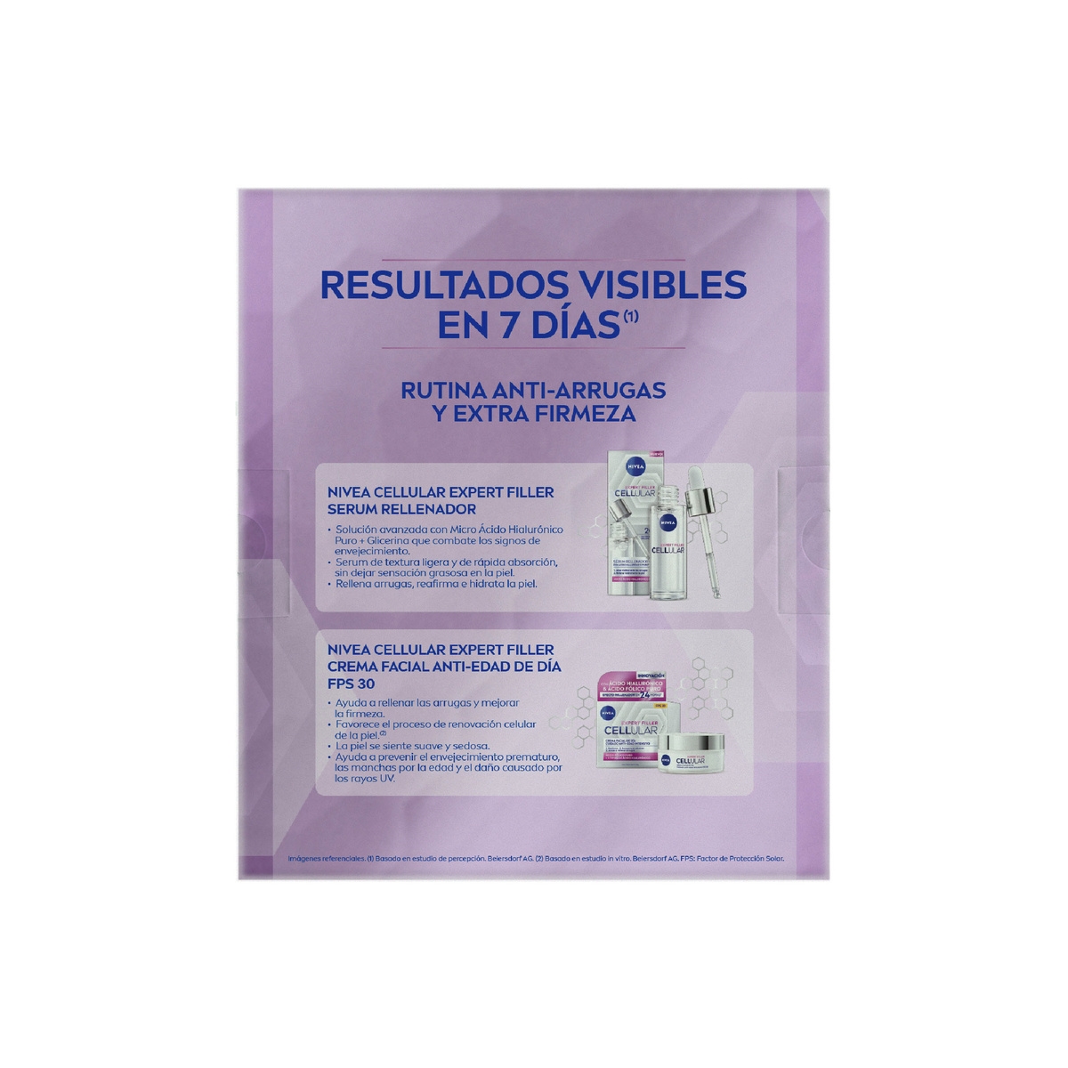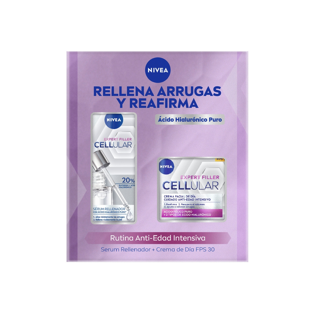 El Pack NIVEA Cellular Expert Filler – Rutina Anti‑Edad Intensiva combina un serum rellenador y una crema de día FPS 30 con Ácido Hialurónico Puro para suavizar arrugas, mejorar la firmeza e hidratar profundamente. Su uso conjunto ayuda a obtener una piel más tersa y rejuvenecida con resultados visibles en 7 días.