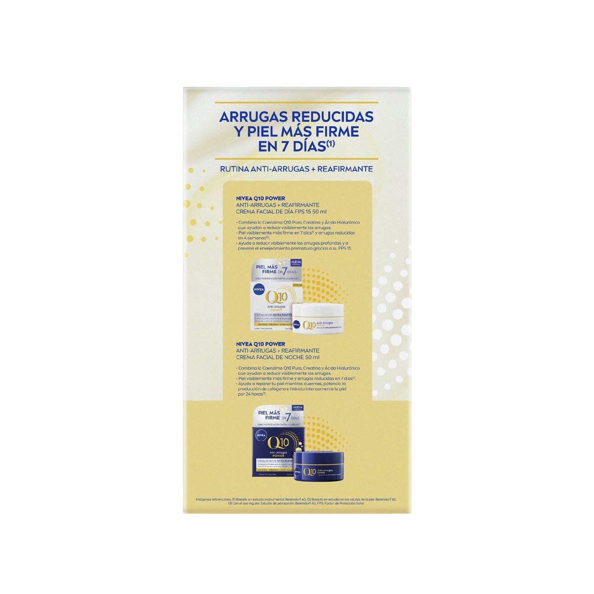 La Rutina Anti-Arrugas + Reafirmante NIVEA Q10 Power combina crema de día y de noche para una piel visiblemente más firme y con menos arrugas en solo 7 días. Con Q10 Pura, Creatina y Ácido Hialurónico, hidrata, reafirma y ayuda a prevenir el envejecimiento, cuidando tu piel las 24 horas del día