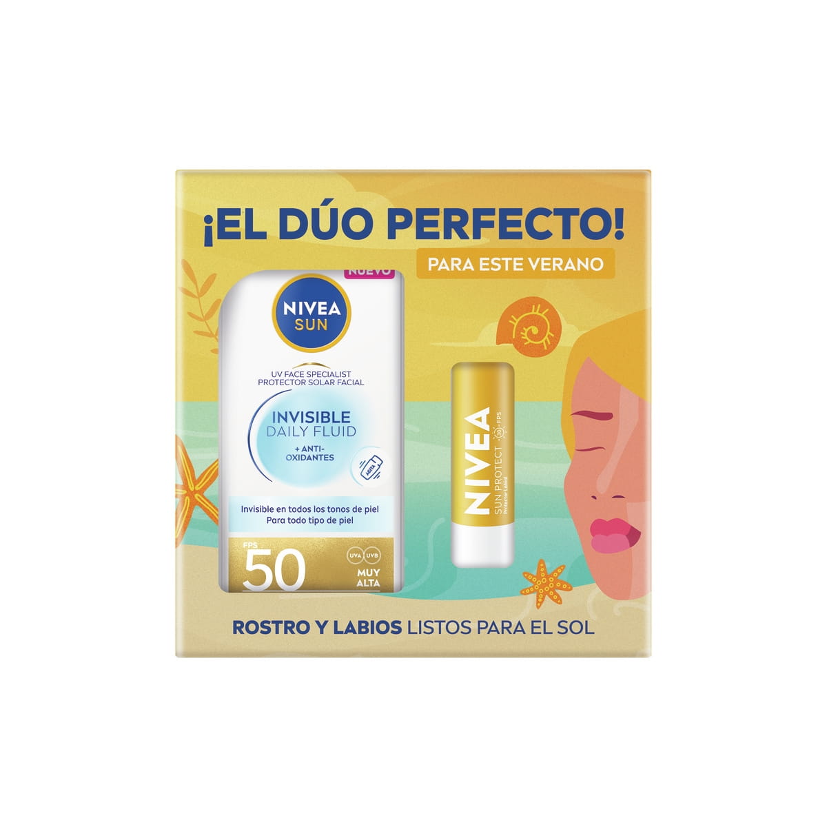 Con nuestro pack disfruta del sol cuidando tu piel y labios con este dúo ideal. El Protector Solar Fluido Invisible FPS50 protege y fortalece la piel del rostro con textura ligera e invisible, mientras el Bálsamo Labial Sun Protect FPS30 mantiene los labios suaves, humectados y protegidos. Juntos brindan protección completa y confortable para tu rutina diaria bajo el sol.