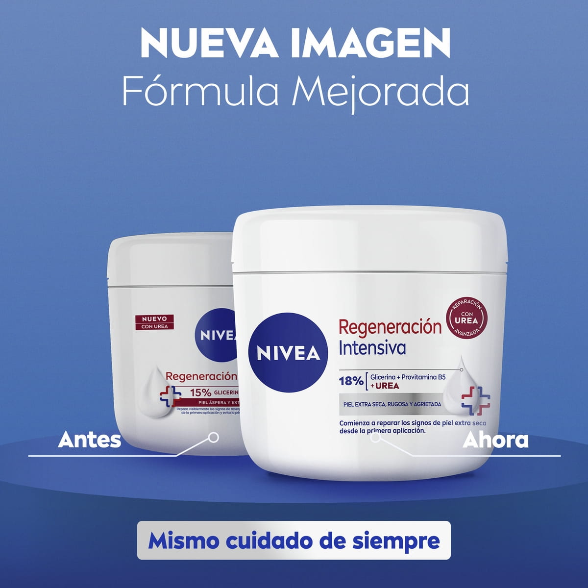 NIVEA Regeneración Intensiva con 16% [Glicerina + Provitamina B5 + Urea] Comienza a reparar los signos de la resequedad de la piel desde la primera aplicación. Exfolia suavemente mientras fortalece la barrera cutánea. Tu piel se siente suave, tersa y luce radiante. Especialmente desarrollada para piel extra seca, rugosa y áspera, la fórmula es: Sin sensación grasosa y de rápida absorción, es apta para niños a partir de 3 años.